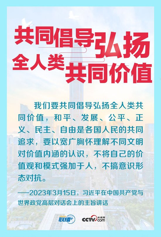 [编者按]“中华民族历来讲求‘天下一家’,主张民胞物与、协和万邦、天下大同,憧憬‘大道之行,天下为公’的美好世界。”千百年来,“世界大同、天下一家”始终是中华民族的理想追求。习近平主席汲取中华优秀传统文化思想精华,多次提及“天下一家”观点,为世界人民求和平、谋发展贡献中国智慧、中国方案。央视网《联播+》推出《跟着习主席看世界·天下一家》系列报道,与您一同感受习主席胸怀天下的情怀与担当。 联播+“和平、发展、公平、正义、民主、自由,是全人类的共同价值,也是联合国的崇高目标。”2015年9月,习近平主席在第七十届联合国大会一般性辩论时,首次提出全人类共同价值并阐释其基本内涵。此后,在诸多重要双多边场合,他多次提及全人类共同价值,并深入阐释中方对这一价值理念的思考和行动。 “大道之行,天下为公。”中国共产党始终秉持全人类共同价值,为世界和平发展作出贡献。央视网《联播+》特撷取习主席关于全人类共同价值的重要论述,邀您一同学习。 ![]() ![]() ![]() ![]() ![]() ![]() ![]() (中央广播电视总台央视网) |